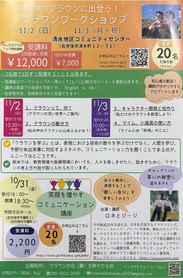 平行プロジェクトとして、佐世保のクラウドファンドでNo.7 欧米の笑いの文化「クラウン」を届けるために「ロネとジージ」を佐世保の離島へ!を実施中。